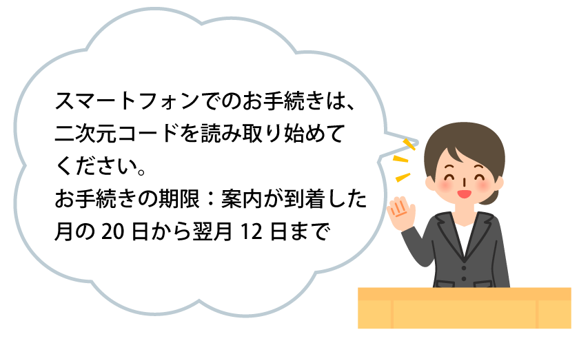 お手続きは、スマートフォンでオンライン手続きもしくは、ハガキでお手続きのどちらかをお選びいただけます。
